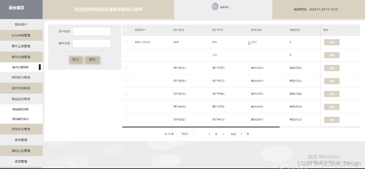 通过事件处理管理页面,您可以输入普通用户、用户姓名、用户学号、事件名称、等级评定等信息,并且可以根据您的需求进行调整,如图5-9所示。