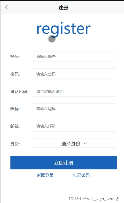 注册,您需要填写您的账户、密码、昵称、手机、邮箱和个人简介等信息,然后点击提交按钮,即可完成注册。请参考图5-2。