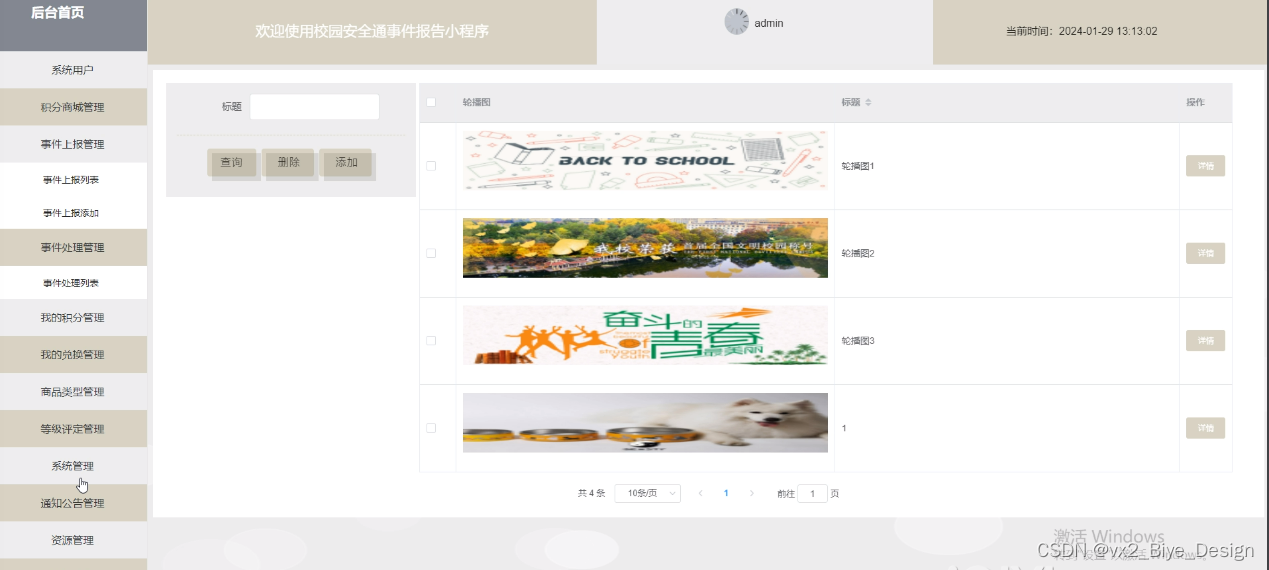 (4)系统管理:当管理员点击“系统管理”时,可查看轮播图管理,如需添加新的轮播图,点击右侧“新增”按钮,上传图片,输入标题,点击“确认”按钮进行添加。
