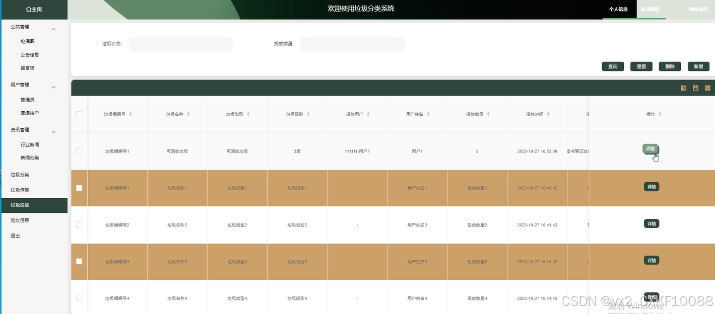 垃圾投放:管理员可以记录和管理用户的垃圾投放情况,进行验收操作。