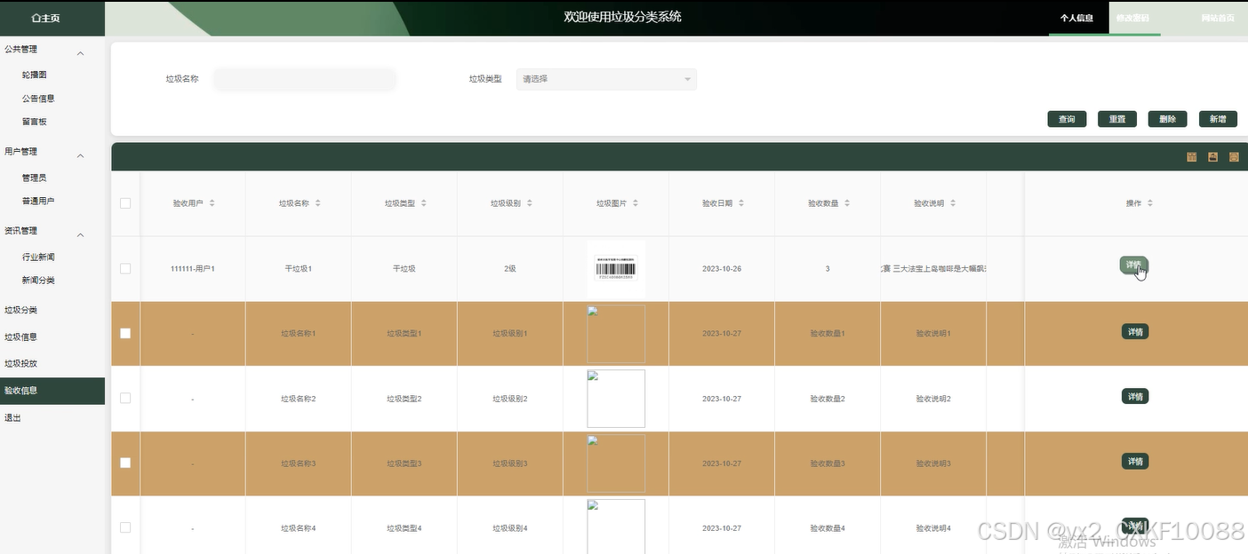 验收信息:管理员可以查看和管理垃圾投放后的验收结果。