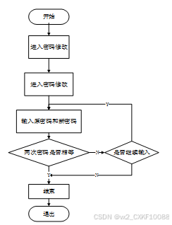 用户通过提供当前密码和新密码进行密码修改操作。系统将验证当前密码的准确性,并确认新密码的合法性和安全性。如果验证通过,则更新用户账户中的密码信息。密码修改功能的设计应考虑密码强度要求、用户友好性和安全性等方面,以确保用户能够方便、安全地修改自己的密码。密码修改流程图如下所示。