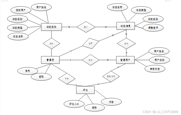 数据库概念结构设计主要涉及数据库的实体和实体之间的关系。通过实体-关系模型或者其他适当的模型,我们将定义系统中涉及的各个实体以及它们之间的联系。垃圾分类系统利用E-R图对上述实体和联系进行描述。