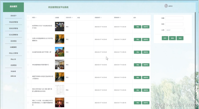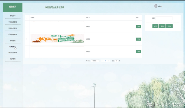 5. 系统管理:在系统管理方面,管理员负责管理轮播图内容,可以查询、删除或添加新的轮播图。这些轮播图通常用于展示学校的重要信息或活动,对于提升用户体验和宣传学校具有重要意义。