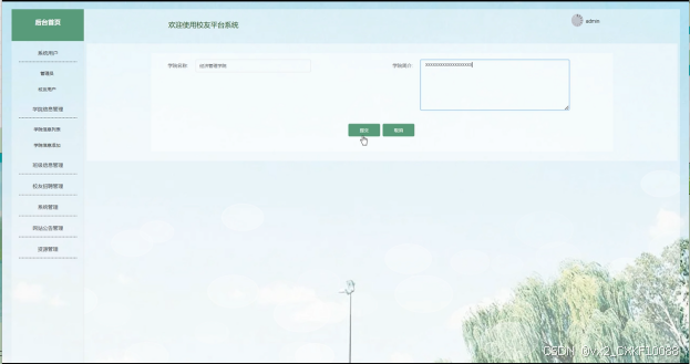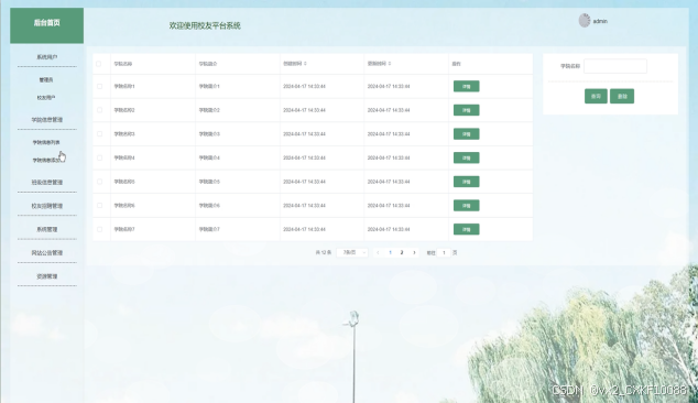 2. 学院信息管理:管理员有权管理学院的详细信息,包括列表展示、添加新学院、查询特定学院、删除不再需要的学院记录以及查看学院的详情。他们还可以利用学校名称作为搜索条件,快速定位到特定学院的信息。