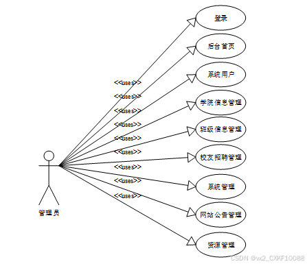 web后台管理上的管理员是维护整个校友平台系统中所有数据信息的,管理员有登录、系统用户、学院信息管理、班级信息管理、校友招聘管理、系统管理、网站公告管理、资源管理等功能。管理员角色用例如图2-3所示。