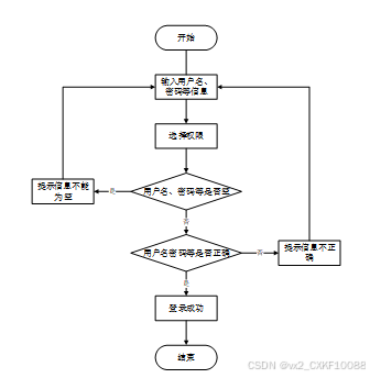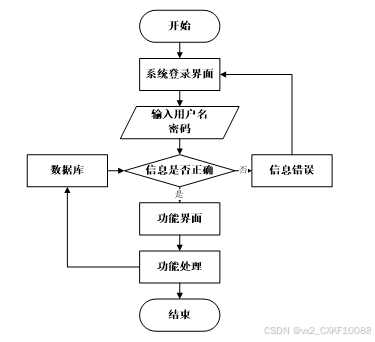 用户打开并进入系统后,会先显示登录界面,输入正确的用户名和密码,系统自动检测信息,若信息无误,则用户会进入系统功能界面,进行操作,否则会提示错误无法登录,操作流程如图2-6所示。