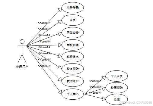 校友平台系统的完整UML用例图分别是图2-2和图2-3。在参与者上包括用户以及管理员。前台上用户角色用例包括校友用户、有首页、网站公告、学校新闻、班级信息、校友招聘、我的账户、个人中心(个人首页、校友招聘和收藏)等功能,校友用户角色用例如图2-2所示。
