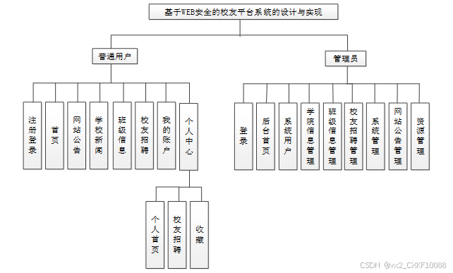 校友平台系统划分为了校友用户管理模块和管理员模块这两大部分。