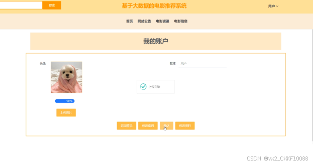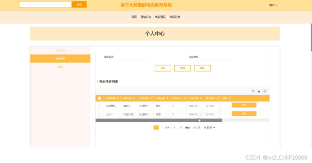 (7)个人中心:普通用户在前台点击“个人中心”可以对个人首页、电影评分和自己收藏的信息进行管理。