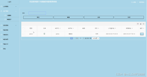 (3)用户管理:管理员可以对电影推荐系统中的管理员以及前台注册的普通用户进行增删改查。
