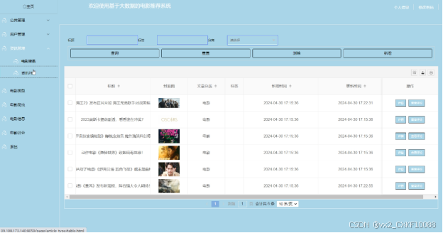 (6)电影爬虫:管理员执行管理电影爬虫,可以对电影数据进行查询、新增、重置或删除。点击全选可以删除12条初始数据,首先点击“爬取”按钮爬取电影数据,接着点击右侧的“发布展示”按钮对爬取的数据清洗整理,数据联动提交就可以发布在前台展示了,每次可爬取10条数据。