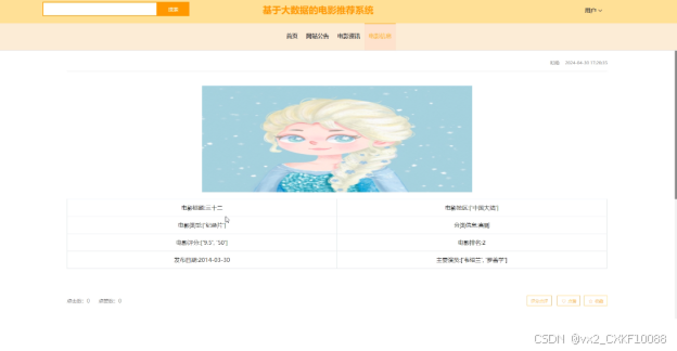 (5)电影信息:用户可以查看电影信息,在查询到自己想要了解的电影信息的时候,可以进入查看详细的介绍,包括电影标题、电影地区、电影类型、分类信息、电影评分、电影排名、发布日期、主要演员等信息,在电影信息详情这个界面,同时支持用户对电影进行评分点评、收藏、点赞以及评论的功能。