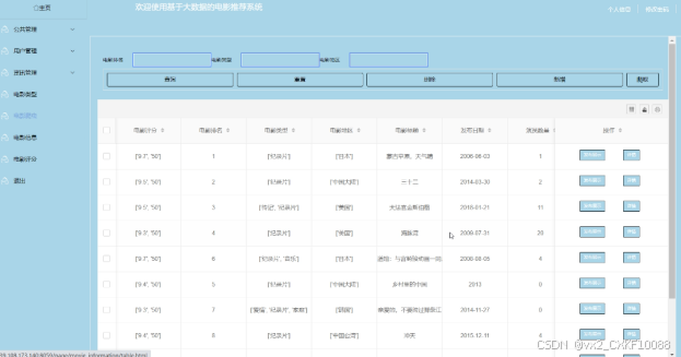 (7)电影信息:管理员点击“电影信息”会显示出已经数据清洗整理好的所有电影信息,如果想要添加新的电影信息,点击“添加”按钮,输入电影标题、电影地区、电影类型、分类信息、电影评分、电影排名、发布日期、主要演员等信息,点击“提交”按钮就可以添加了,同时可以选择某一条电影信息,点击“删除”进行删除,也可以对用户提交的电影评论的信息进行管控。