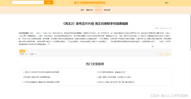 (4)电影资讯:当用户点击“电影资讯”这一菜单按钮,会显示管理员在后台发布的所有的电影资讯,可以查看详情,进行收藏、点赞、评论等。