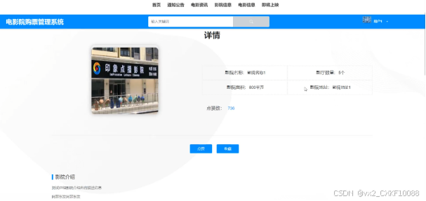 (5)影院信息:普通用户可以搜索、浏览和查看影院信息,包括影院的影院名称、影厅数量、影院面积、影院地址、影院介绍等。用户可以选择感兴趣的影院并查看更多详细信息并进行点赞、收藏和评论操作。