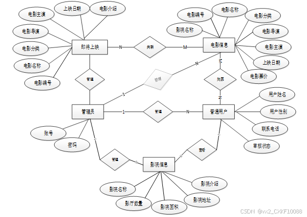 下面是整个电影院购票管理系统中主要的数据库表总E-R实体关系图。
