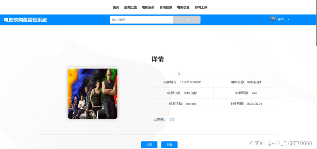 (6)电影信息:用户可以查看电影的所有信息,包括影院名称、电影编号、电影名称、电影分类、电影导演、电影主演、上映日期、电影时长、电影场次、放映影厅、放映时间、电影票价、影院地址、电影介绍等。支持通过电影名称或电影分类搜索的方式对电影信息进行查询,在查询到自己想要了解的电影信息的时候,可以进入查看详细的介绍,点击“购票”这一按钮以后会跳转到电影购票信息填写的界面,根据提示填写好购票的信息,点击“提交”以后购票就完成了,在电影信息详情这个界面,同时支持用户对喜欢的电影信息进行收藏、点赞以及评论的功能。