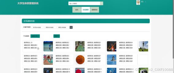 在线课程:用户点击可通过搜索教师姓名、课程名称和课程分类进行查看在线课程列表;可下载和观看课程视频,同时可进行点赞、收藏和评论。界面图如下。