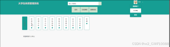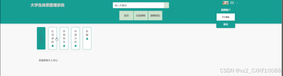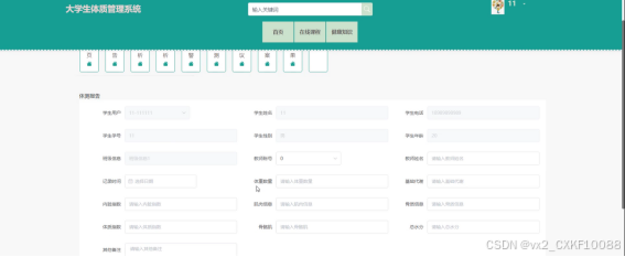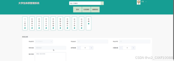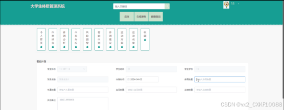 (4)个人中心:用户点击头像可查看“个人中心”,包括个人首页、体测报告、体测分析、风险预警、智能体测、运动方案、运动成果和收藏。点击“体测报告”可填写体测信息,包括学生用户、学生姓名、学生电话、学生学号、学生性别、学生年龄、班级信息、教师账号、教师姓名、记录时间、体重数量、基础代谢、内脏指数、肌肉信息、骨质信息、体质指数、骨骼肌、总水分和其他备注;点击“体态分析”可填写体态分析信息,包括学生账号、学生姓名、学生学号、班级信息、身高数量、体重数量和备注信息。点击“智能体测”可填写智能体测信息,包括体测时间、身高数量、体重数量、血压数量、血糖数量和其他备注。