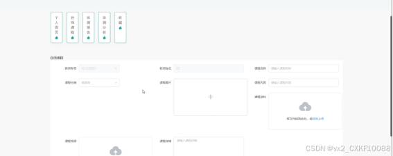 个人中心:教师用户点击头像可查看“个人中心”,包括个人首页、在线课程、体测报告、体测分析和收藏。点击“在线课程”可填写课程信息,包括教师账号、教师姓名、课程名称、课程分类、课程图片、课程内容、课程资料、课程视频和课程详情。界面图如下。