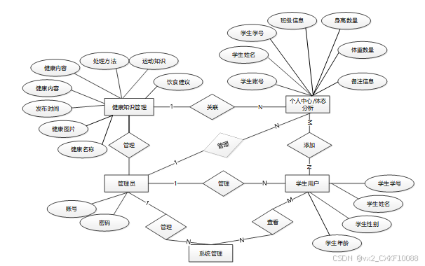 下面是整个大学生体质管理系统中主要的数据库表以及总E-R实体关系图。
