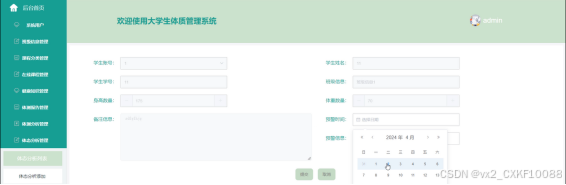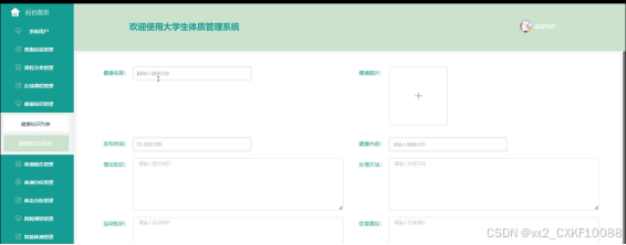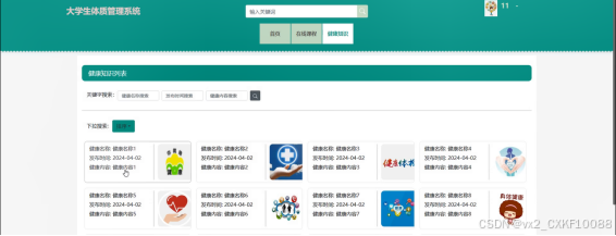 基于SSM的大学生体质管理系统是一款综合性平台,融合了在线课程、健康知识、体测报告等多项功能,旨在为广大大学生提供全方位的健康管理服务。通过在线课程和健康知识模块,用户可以随时学习健康知识,掌握科学的健康管理方法;同时,系统还提供智能体测功能,能够实时监测体征数据,进行体测分析,为用户量身定制健康管理方案。