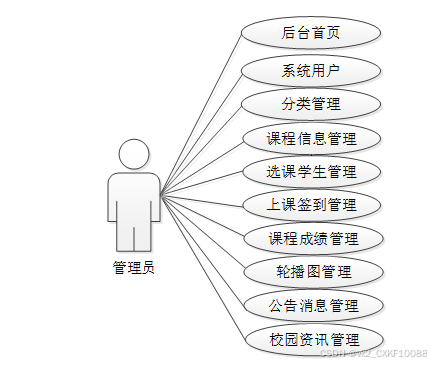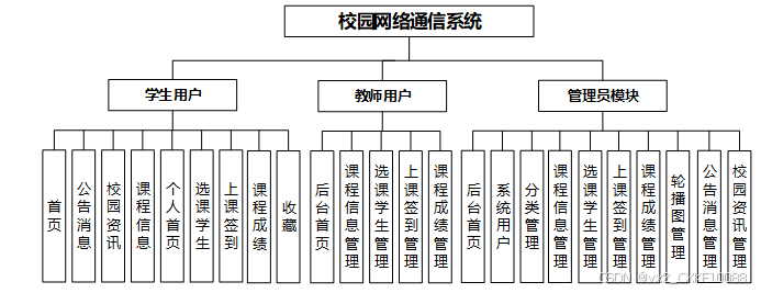 The system provides students with functions such as homepage, announcement messages, campus information, course information, personal homepage, course selection, attendance, course grades, and bookmarking. The administrator has a backend homepage, system user management, classification management, course information management, course selection student management, class attendance management, course score management, carousel map management, announcement message management, and campus information management. Teachers have a backend homepage, course information management, course selection student management, class attendance management, and course score management.