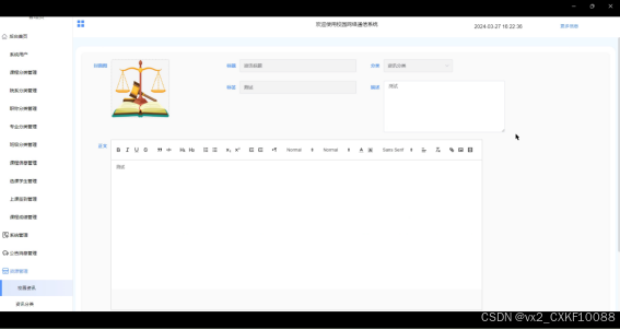 - 公告消息管理:发布和管理系统的公告信息,确保信息的及时性和准确性。