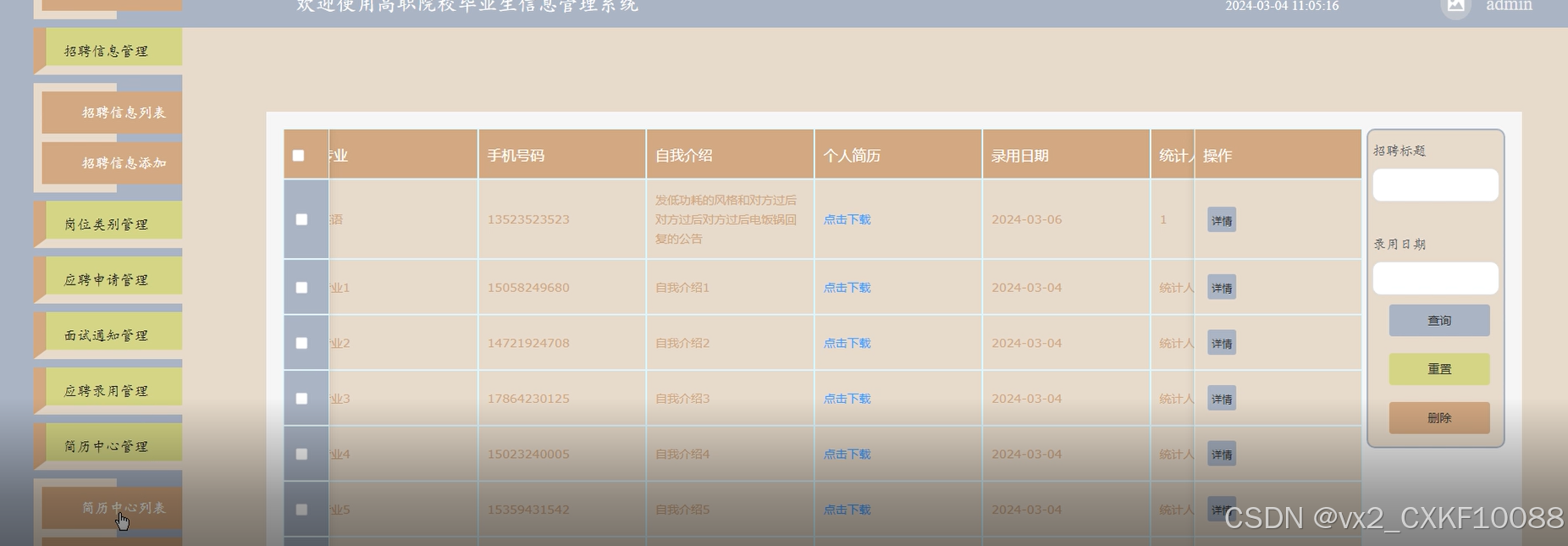 简历中心管理:管理员可以管理学生上传的简历,包括审核、删除等功能。如下图所示。