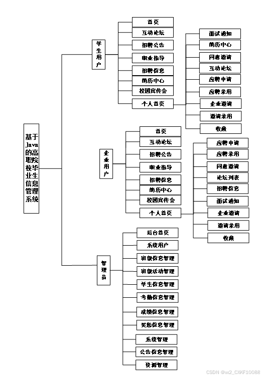 (3)在基于Java的毕业生信息管理系统的实现中,首先要确定系统的技术,然后进行在线确认,以确定系统的用户角色,并根据这些角色划分出相应的功能模块。系统的设计主要将用户分为管理员、学生用户、企业用户,每个角色都有其独特的特点,而且每个功能模块都有其特定的功能,但是系统的数据库都是交互式的,学生用户可以随时根据自身的需求查看互动论坛,招聘公告,职业指导,招聘信息,简历中心,校园宣传会等,管理员可以快速收集用户的详细信息,并能够在第一时间响应用户的需求。