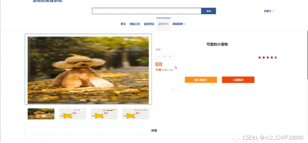 (4)宠物中心:点击“宠物中心”这个菜单,可以查看到系统中所有添加的宠物中心,支持通过关键词进行查询,如果想要了解某一宠物中心的详细信息,点击后面的“详情”会进入详情查看界面,可以对宠物中心进行添加购买、收藏、评论等操作;