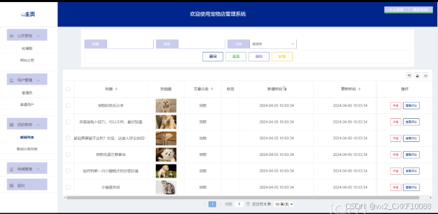 管理员可以对宠物店管理系统中的新闻列表、新闻分类列表信息进行增删改查。界面如下图4-10所示。