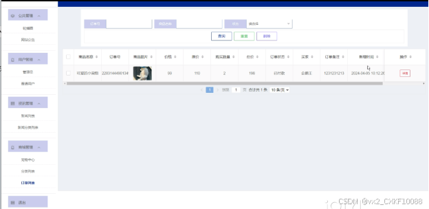 宠物店管理系统中的管理人员是可以对宠物店管理系统内的所有订单进行维护和管理的,支持增删改查操作。界面如下图4-8所示。