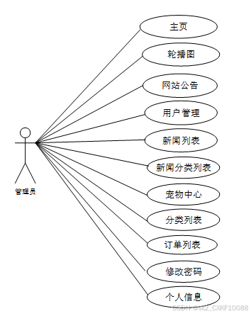 web后台管理上的管理员是维护整个宠物店管理系统中所有数据信息的。管理员角色用例如图2-3所示。
