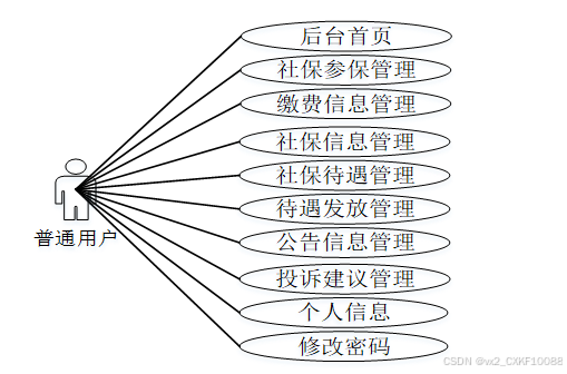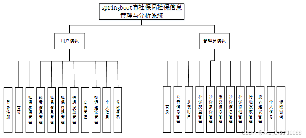 根据市社保局社保信息管理与分析系统的角色需求分析,可以划分为普通用户和管理员两大模块。其中普通用户具有后台首页、社保参保管理、缴费信息管理、社保信息管理、社保待遇管理、待遇发放管理、公告信息管理、投诉建议管理、个人信息、修改密码等功能,能够对自己社保参保、缴费、待遇等信息进行搜索、查看和管理,并可以进行投诉建议;而管理员则拥有后台首页、系统用户(管理员、普通用户)、社保类型管理、社保参保管理、缴费信息管理、社保信息管理、社保待遇管理、待遇发放管理、公告信息管理、投诉建议管理等功能,及时更新系统相关信息,维护系统的正常运转