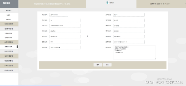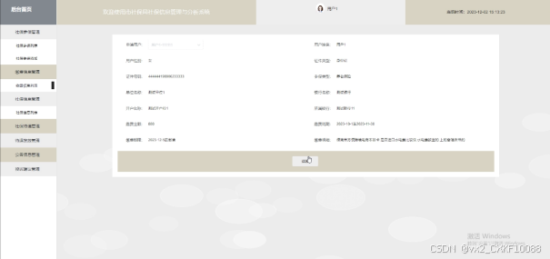 设计和实现社保信息管理和分析系统可以提高社保管理的效率和准确性,减少了传统手工操作带来的错误和遗漏。根据该系统的需求分析可以划分为管理员和普通用户两大模块,实现后台首页、系统用户(管理员、普通用户)、社保类型管理、社保参保管理、缴费信息管理、社保信息管理、社保待遇管理、待遇发放管理、公告信息管理、投诉建议管理等功能;管理员可以对系统进行维护和管理,普通用户可以方便地查询和管理自己的社保信息,并进行缴费操作,提高了公民参与社保管理的积极性;并且能够对社保数据进行有效管理和分析,为制定科学合理的社保政策提供支持。