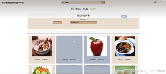 (4)育儿食谱:用户点击育儿食谱可以看到管理员发布的育儿食谱,点击选择其中一个可以查看育儿食谱详情,可以进行点赞、收藏等操作。