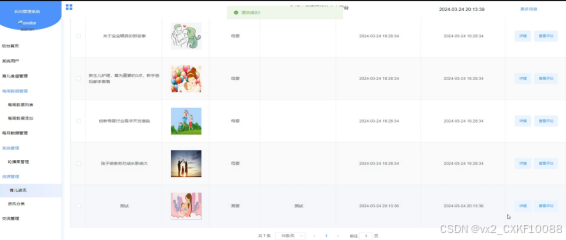 Overall, the design and implementation of the Spring Boot-based parenting experience-sharing platform is a complex and challenging project. Through our efforts and innovation, we provide users with a convenient and efficient platform for parenting communication, and provide strong support for parents on the road of parenting. In the future, we will continue to optimize the platform functions, improve the user experience, and bring benefits to more parents and babies.