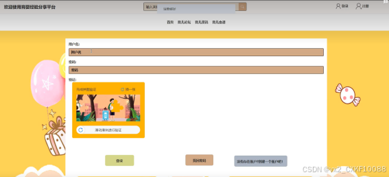 注册模块满足用户两部分,当用户想要进行育婴经验分享平台相关信息的查询管理的时候,就必须进行登录,如果没有账号的话,在登录界面,点击“注册”按钮就会跳转到注册的界面,根据提示填写好注册信息,添加提交,注册的信息在数据库中就添加完成了,然后再输入填写好的账号和密码进行登录,其主界面展示如下图4.2所示。