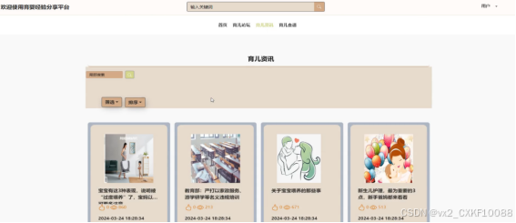 用户在首页导航栏上我们会看到“育儿资讯”这一菜单,支持通过关键字进行快速查找育儿资讯详细信息,用户可对育儿资讯进行点赞、收藏、评论等操作;界面如下图4.4所示。