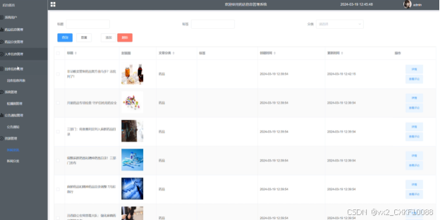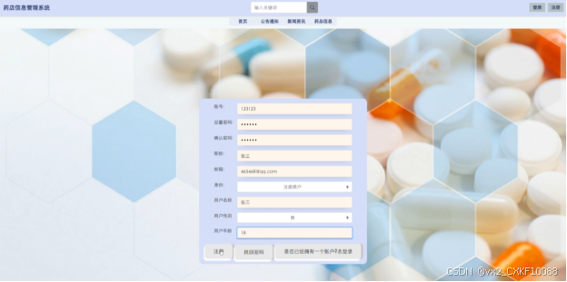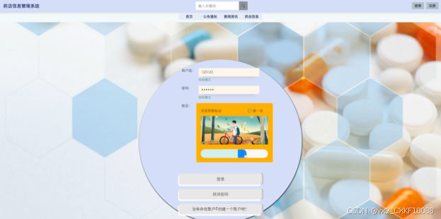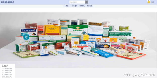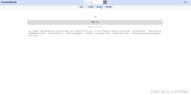 (2)查看药店信息管理系统的首页信息:药店信息管理系统的首页信息包含了首页、公告通知、新闻资讯、药品信息等。