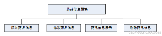 药店信息管理系统是中需要存储不少药品信息,其模块功能结构,具体的结构图如下: