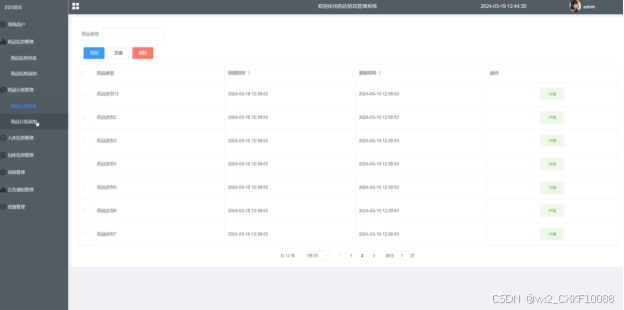 管理员点击“药品信息管理”会显示出所有的药品信息信息,支持选择药品名称或分类类型等对信息进行查询,如果想要添加新的药品信息,点击“添加”按钮,输入详细信息,点击“提交”按钮就可以添加了,同时可以选择某一条药品信息,点击“删除”进行删除。可以对药品信息进行出入库管理,也可以对用户提交的药品信息评论的信息进行管控。药品信息管理界面如下图4-7所示。