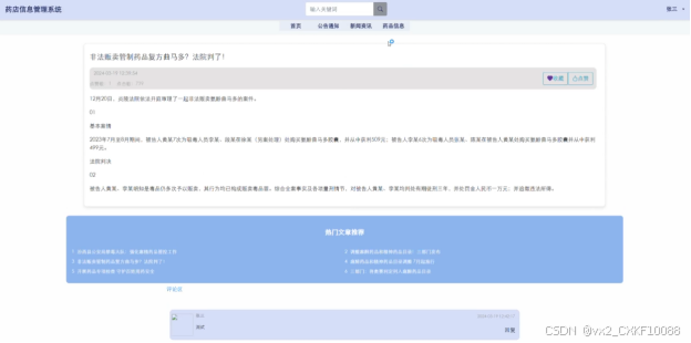 当访客点击药店信息管理系统中导航栏上的“新闻资讯”后将会进入到该“新闻资讯”列表的界面,然后选择想要看的新闻资讯,点击进入到详细界面,在详细界面可以收藏+赞+评论等操作。新闻资讯界面如下图4-5所示。