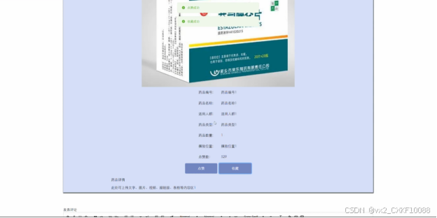 (5)药品信息:用户可以查看药品信息信息,在查询到自己想要了解的药品信息的时候,可以进入查看详细的介绍,包括药品编号、药品名称、适用人群、药品类型、药品数量、摆放位置、药品详情等信息,在药品信息详情这个界面,同时支持用户对喜欢的药品信息进行收藏、点赞以及评论的功能。