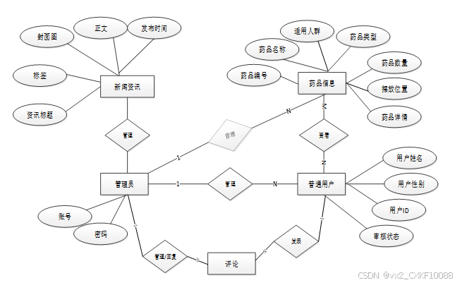 下面是整个药店信息管理系统中主要的数据库表总E-R实体关系图。