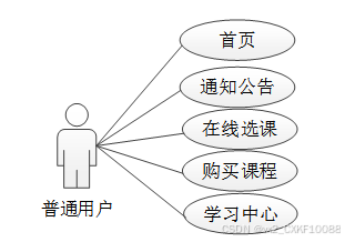 系统用例分析是对系统中各个功能模块的用户需求和行为进行分析,以识别和描述不同的用户用例。通过系统用例分析,可以深入了解用户在平台上的操作流程和交互方式,为系统设计和开发提供指导,并确保平台能够满足用户的需求和期望。在线学习系统中用户角色用例图如图2.1所示: