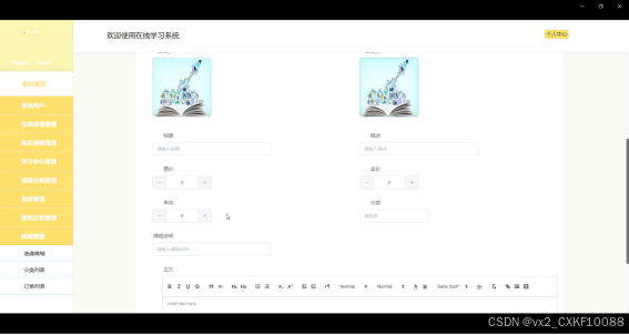 - 在线选课管理:管理员可以管理课程信息,包括添加、编辑、删除课程,设置课程属性和价格等。