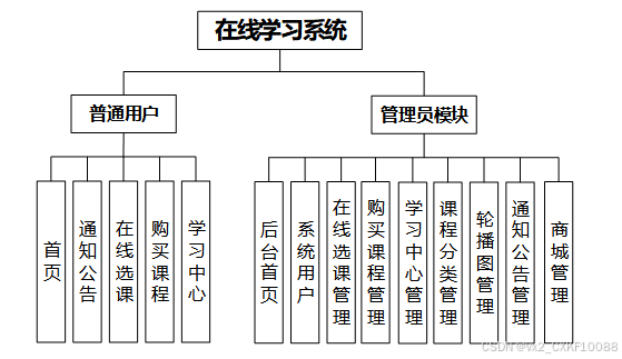 该在线学习系统中,管理员拥有后台首页数据统计、用户和课程管理、通知公告发布、商城管理等功能;而普通用户则可在小程序上浏览课程、购买课程、查看通知公告、管理学习进度。管理员可通过后台首页实时监控销售数据,进行用户和课程的管理和发布通知公告,同时管理选课商城。普通用户可方便快捷地选购课程,管理个人学习进度。这些功能为在线学习提供了全面的管理和学习支持。具体功能需求分析如下:
